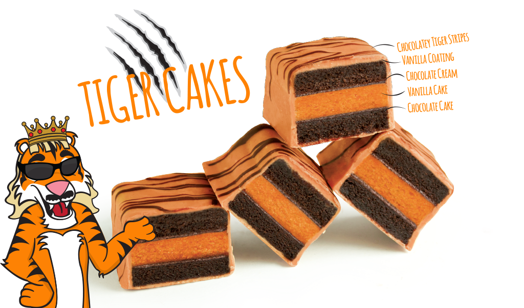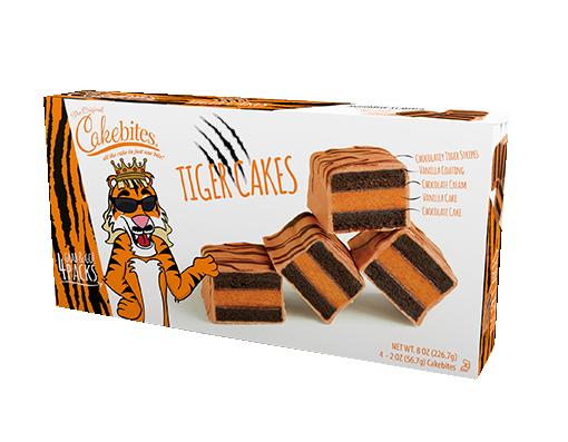 Meet Ty, an all American chill tiger, born in captivity but escaped in the 70s where he seems to have acquired his style (what’s with the moustache?) and a taste for the good life. Being the King of the Jungle is hard work, but being the King of CakeBites, for a tiger with a sweet tooth? Purrfect! Sure, Ty could forage the countryside for meals but rabbits are nimble and people generally travel in cars. Ty prefers a quick trip to his favorite retailer for a Made in America Tiger Cake: chocolate cream, layered with vanilla and chocolate cake, enrobed in vanilla frosting and topped with Ty’s very own tiger stripes. It’s the cat’s meow! Like Ty, Tiger Cakes are on the go; so grab a box while you can. And please take Ty’s advice, if you want to pet a cat, pick up some Tiger Cakes on the way to your local shelter and consider adoption. Share the love and the Tiger Cakes!