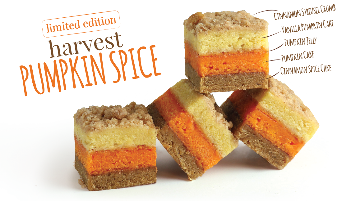 Autumn. Summer sets and winter is on the horizon. Farmers rush to harvest and the rest make time to savor the disappearing days and life’s bounty: hot apple cider, pumpkin pie, children begging for candy and, of course, Harvest Pumpkin Cakebites. How does one indulge in Fall? We offer you naturally colorful pumpkin cake, bound by love and our pumpkin jelly and crowned with a decadent cinnamon streusel. Poetry in a single bite. John Keats referred to the Harvest as a “season of mists and mellow fruitfulness.” Did he know pumpkins are a fruit? Pumpkins have been around since 7,000 BC but the Harvest Pumpkin Cakebite is only available for a limited time. Savor Autumn, fall for a Cakebite.